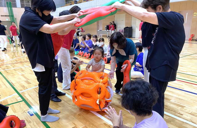 気持良い秋風の吹く中、会員の皆さん、パパ・ママ、子ども達が会場いっぱいに参加して頂きました。3B体操を楽しんで頂きたいと、前半はベルターでパーンパンとリズミカルに声も出して動き、次にベルでしっかりトレーニングを行いました。ふれあいタイムでは会員さん達がトンネルをつくり、その中を子ども達がベルの大玉転がし!「がんばれー」と大きな声と拍手が送られ、熱気と笑顔に包まれました。