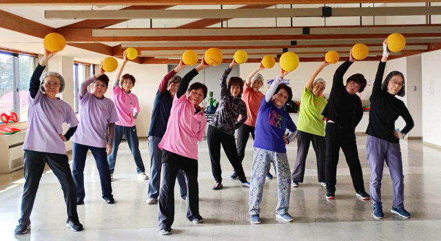 夜の教室から昼間の教室に切り替えて20年。70代から80代の会員さん12名、月4回の教室です。筋トレや有酸素運動に力を入れ、いつまでも若々しく、元気でいられるように、仲間と楽しみながら活動しています。